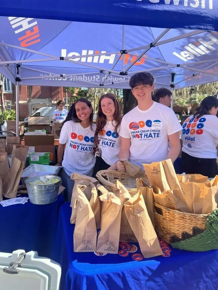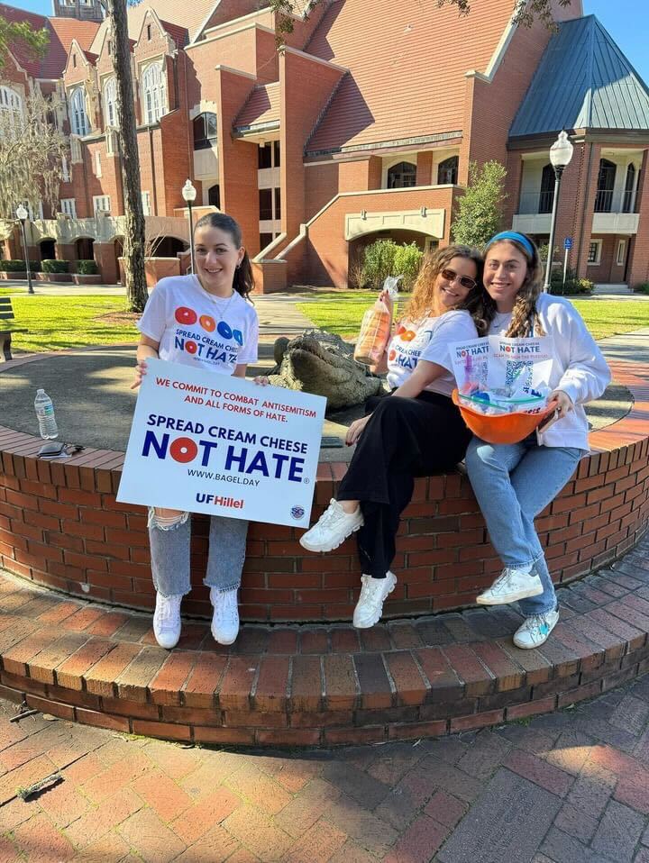 This week, University of Florida (UF) Hillel hosted its fifth annual Spread Cream Cheese, Not Hate event. Created as a program to combat antisemitism and all forms of hate, on-campus at the University of Florida and across all communities, Jewish and non-Jewish Bagel Day student volunteers set up stations across campus, inviting Gator Nation to sign the Spread Cream Cheese, Not Hate pledge. Signers received a free bagel and cream cheese in appreciation.
