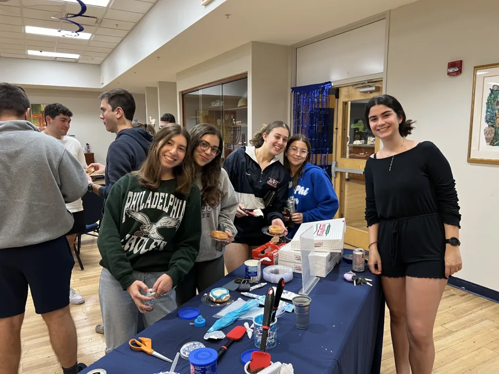 Over fifty Hillel students gathered for a celebration originally intended to be an outdoor bonfire, but the persistent Florida rain called for alternate plans. Event organizers quickly pivoted to create a fun, festive Hanukkah party inside complete with candle lighting, board games, dreidels, donut decorating, and other delicious foods.